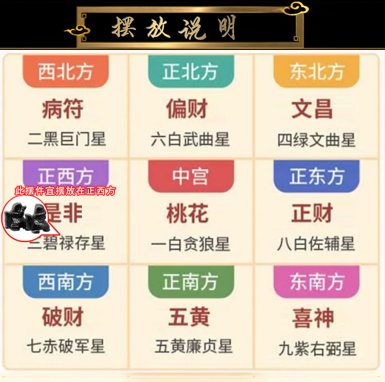 这款福星呈祥是由一对黄色老虎守护元宝构成的。其中元宝五行属金,而三碧禄存星五行属木,在五行相生克的原理当中,金克木,能够压制三碧禄存星的作用,再加上黄色老虎的震慑与压制,此凶星想要作乱是比较难的。因此在流年的西北是非方位摆放一对【祥安阁福星呈祥】摆件是非常不错的选择,以老虎的威严以及元宝的力量来镇压凶星的影响,保佑人们在流年当中运势顺利,无是非之扰,时来运转,危机解除。