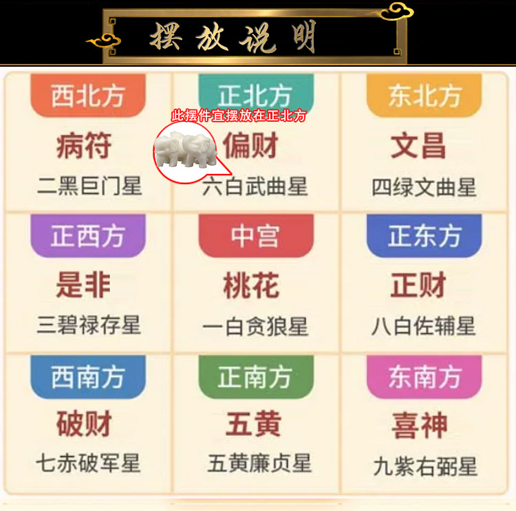 荷麟送财是由一对黑色麒麟背驼元宝,守护莲花宝座构成的。麒麟五行属土,在五行相生克的原理当中能够催旺五行属金的六白武曲星。而荷花是圣洁干净的,能够化煞解小人危机。至于元宝则是可催财,催运旺贵,为人增添福运的。因此在流年的时候,若是想增强偏财运的作用,可考虑在流年正南偏财位摆放一对【祥安阁荷麟送财】摆件来旺运,保佑屋主在流年里鸿运当头,可得大富贵。