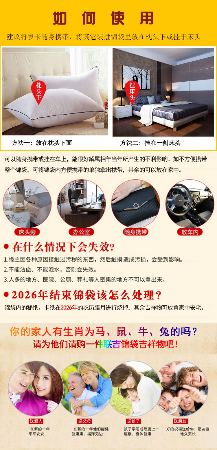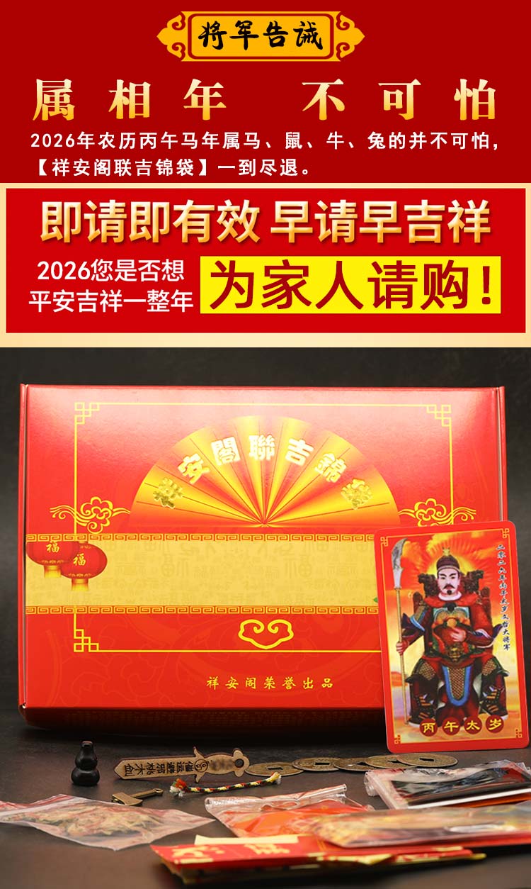 - 2026年属马值太岁/刑太岁、属鼠冲太岁、属牛害太岁、属兔破太岁;祥安阁联吉锦袋,针对2026流年太岁秘制,内含多种化解犯太岁生肖用的殊殊吉祥用品,每种物品均富有神奇的灵性和特殊的化煞及转运功效,使犯太岁生肖拥有化解太岁的联吉锦袋,能挡煞去灾,逢凶化吉、遇难呈祥、健康、财运、事业、学业、事事顺通,名利双全,若再摆放和佩带上自己的流年吉祥物,在新的一年里,吉祥平安,大吉大利。收到后可将此联吉锦袋挂在家中、床头或者摆放在办公桌上,也可以随身携带或挂在车上,能很好化解太岁当年所产生的不利影响,化煞辟邪、安身健康。越早奉请,与自身命局相融合,灵力越大,能量越强劲。