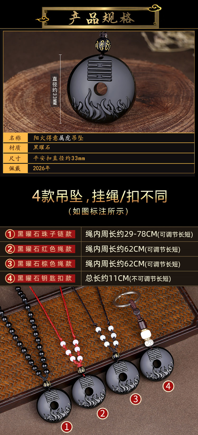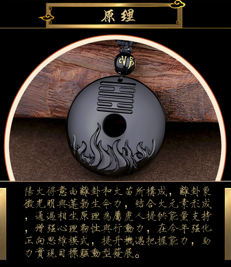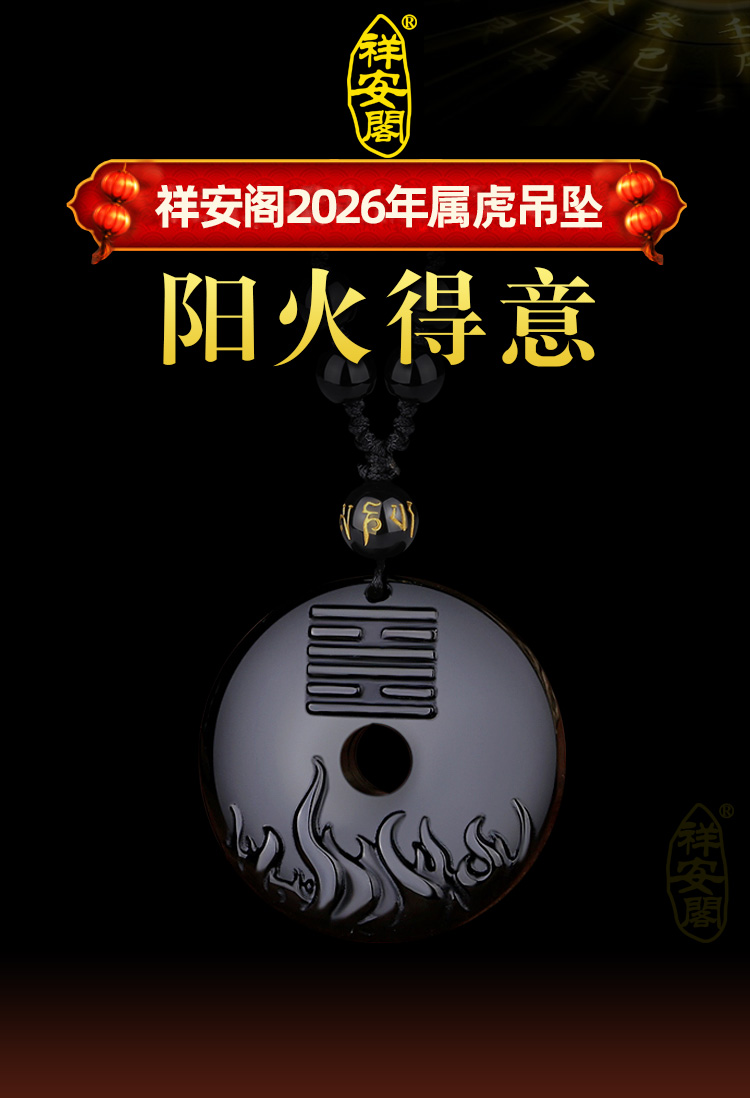 - 在进入2026年的时候,属虎人虽然运势上与流年太岁三合,但受凶星“白虎”阻碍,流年犯小人严重,且“地杀”干扰,易惹邪气入体,久病多灾。因此属虎人可在今年的时候佩戴一件【祥安阁阳火得意】吊坠,以旺盛的火源来燃烧邪祟和凶灾,保佑自身运势的红火。而生肖虎五行属木,佩戴具有火元素的阳火得意吊坠也能够起到五行旺运作用,再加之火元素与离卦的能量相呼应,可进一步提升属虎人的活力和能量,保佑其在2026年里热情和富有冲劲,流年运势能够积极向上,如骄阳似火般绵绵不绝。